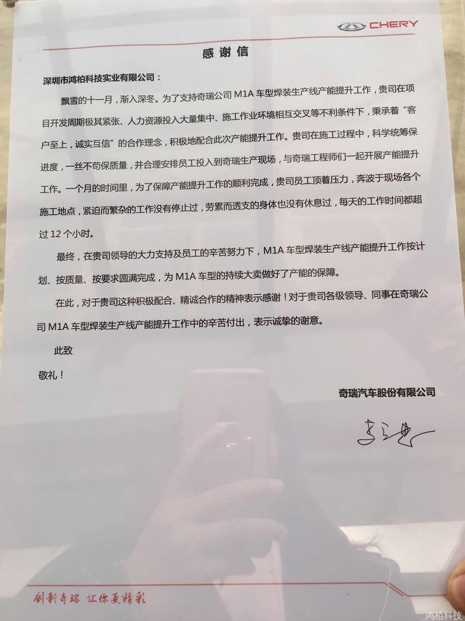 深圳市鴻栢科技實業有限公司在奇瑞汽車M1A車型焊裝生產線產能提升工作中,我公司工作人員踏實的工作作風、精湛的專業技術、任勞任怨的工作態度獲得了該公司各級領導、職工的高度贊譽。這不是客戶第一次為鴻栢科技五星級的技術服務承諾點贊,也絕對不是最后一次。鴻栢人將繼續前行,努力做的更好!