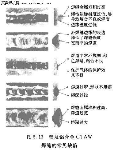 熱輸入和焊工技術對于焊縫質量有很大的影響。圖5.13給出了鋁及鋁合金GTAW焊縫的常見缺陷。如果熱輸入太低(一般是由電流太小或焊速太快引起的),焊道高而窄,熔深淺、而且焊縫邊緣易產生熔合不良等缺陷。焊接速度過快時,焊道窄小、熔深淺。如果熱輸入過大(一般是因電流過大或焊接速度過小引起的),焊道則寬而平,熔深過大,甚至會產生飛濺。當焊槍與工件直徑之間的距離太大時,電弧過長,氣體保護效率降低,焊縫表面成型變差,這種情況對于鋁合金的焊接尤其明顯。