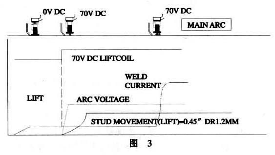 緊接著焊槍中的提升線圈得到70V(DC)的電壓,線圈動作,將螺柱提升到(0.45″1.2mm),已被激活的金屬表面在電壓作用下由此而產生拉弧,由于提升高度一定,電弧電壓最終約為24V(DC)。該電壓為維弧電壓,為主電弧的順利導入創造了條件,如圖2所示。