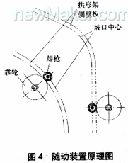 該裝置(如圖4)安裝在焊槍上,在焊接過程中張緊裝置保證靠輪貼住側壁板,并保持隨動裝置上靠輪中心與連線垂直于側壁板,因此消除了焊槍偏離焊縫坡口中心的現象,從而解決因工件偏差造成的焊偏現象。
