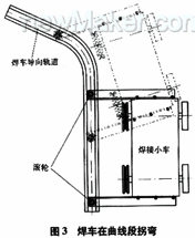 該裝置(如圖2)分上下兩層;上層為工件定位,夾緊裝置;下層有內外焊車導向軌道(軌道形狀同設計焊縫中心)和焊車行走面。導向軌道與工件坡口上下相對應;在焊車側面增加兩滾輪,滾輪在與理論焊縫坡口中心相同的軌道內,在焊車驅動力作用下強近焊車在曲線段拐彎(如圖3);焊槍中心與其中一滾輪上下對應,從而實現了焊槍中心的行走軌跡與理論焊縫坡口中心相同。