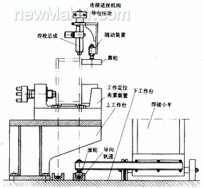 利用原焊車的驅動裝置、送絲機構和控制箱,增回去了焊車導向裝置、焊槍、控制箱托架、橫梁托架和焊絲軻等。強近焊車按照預定的軌跡行走,改病善焊槍的導電性和送絲的穩定性,在各連接處,采取相應的絕緣措施(如:焊車與工作臺、焊絲架與控制箱等)。