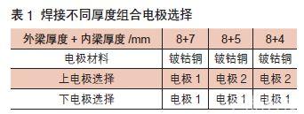 由于內外梁為不等厚度的低碳鋼板,通常情況下,不同厚度不同材料焊接時,形成熔核不以貼合面對稱,而向厚板或者導電導熱性差的焊件偏移,厚度相差越多,現象越明顯,結果貼合面尺寸小于該熔核直徑,使得焊接強度降低。因此,當焊接內外梁厚度差距較大縱梁時,電極設計應當采用不同形狀上、下焊極焊接,與厚板外梁接觸下電極應當相對增大焊極端面,同時增大下電極冷卻水腔直徑,使得下電極散熱增強,而上電極相對焊接端面及冷卻水腔較小,溫度場向外梁一側偏移,使得貼合面熔核直徑增加,焊接強度相應提升。另外,可適當增加上電極有效焊接長度,以提高焊極使用壽命,焊接不同厚度組合內外梁時電極選擇如表1所示,電極1、2分別如圖2、圖3所示。